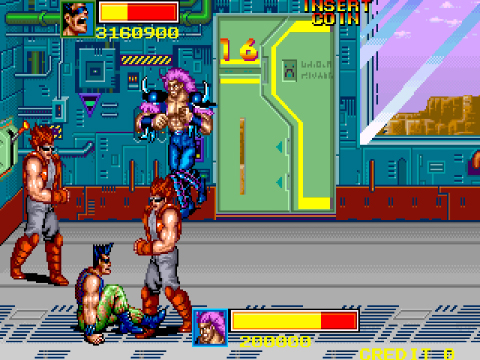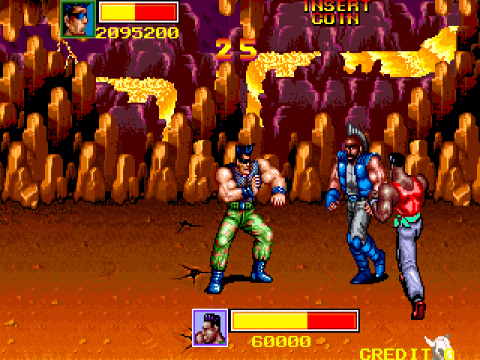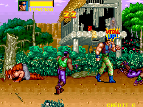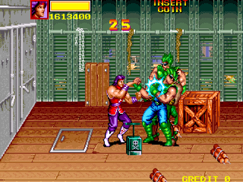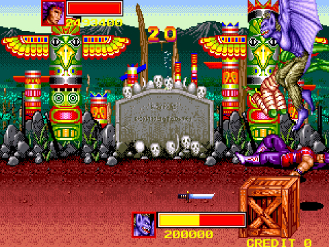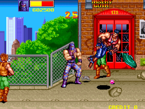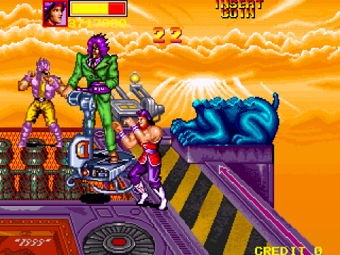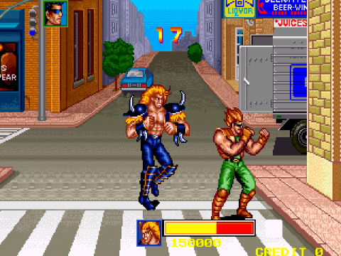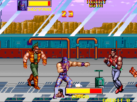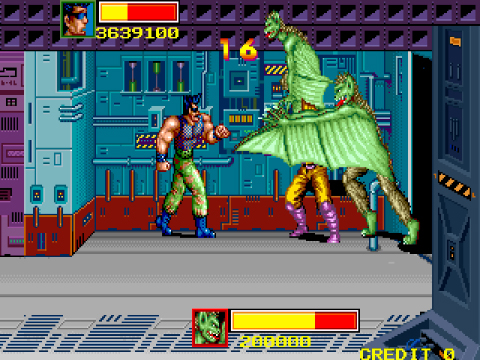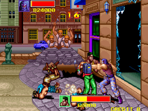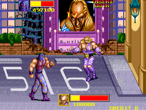 ということで倒すとヒロインとJOEがキスして終了となります。正直クリアすると、何だったんだ?という疑問が湧くゲームです。というか、彼女は改造されてなかったのかと不満に思ってしまった私はスプラッタハウスが大好きです。というわけでクリアまでスクショを集めたわけですが、感想としてはよく訴えられなかったなと(笑)。制作したイースト・テクノロジーは上向きに落ちるテトリスを行う『バルーンブラザーズ』など微妙に怪しいゲームをよく作る会社ではあるんですが、ここまで露骨に『ファイナルファイト』や『ダブルドラゴン』、「北斗の拳」をパクっていると笑うしかありません。いいところどりをしようとしたら中途半端になったというよくあるやつですね。このゲームが稼働していた時期に私はゲーセンにいませんでしたのでどうだったのか怪しいところですが、すぐに撤去されたのではないかというのが私の予想です。多分これ売上は上がらないよ。これを置くぐらいなら前年にリリースされたカプコンの『ザ・キング・オブ・ドラゴンズ』とかのほうが絶対売上がいいと思いますしね。