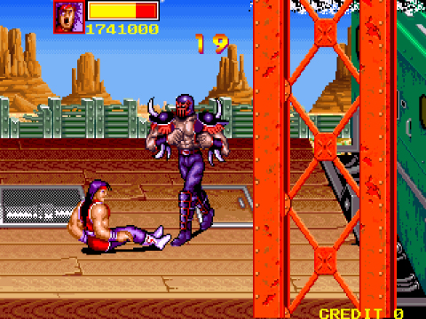 そして第3ステージ。列車に乗って進んでいくステージであります。中ボスはいなかったような……。そしてボスはどう見てもジャギ。それだけのステージ。あ、ムチ持ったボンテージのお姉ちゃんも登場します。