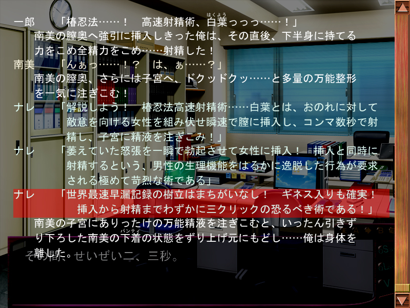 エロゲーでよくあるやつですね、ミラクル精液。奇怪な忍法には困惑するのに、ミラクル精液は急速に理解できてしまうわ。